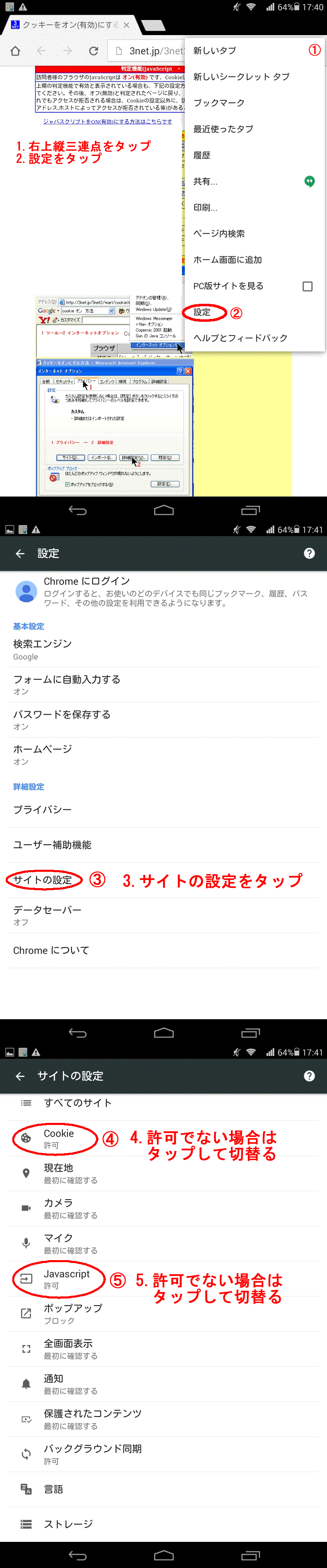 クッキー・ジャバスクリプトをオン(有効)にする方法 Android版グーグルクロム(GoogleChrome)編