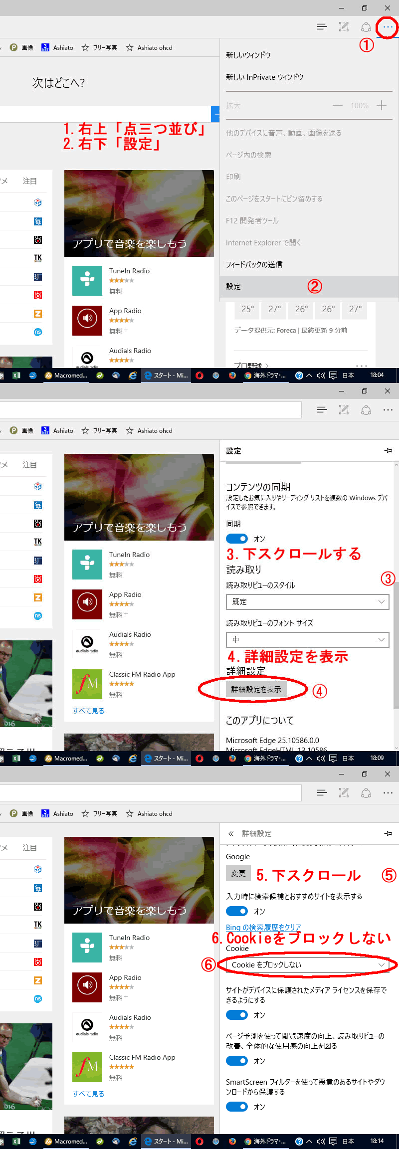 クッキー・ジャバスクリプトをオン(有効)にする方法 マイクロソフトエッジ(MS Edge)編