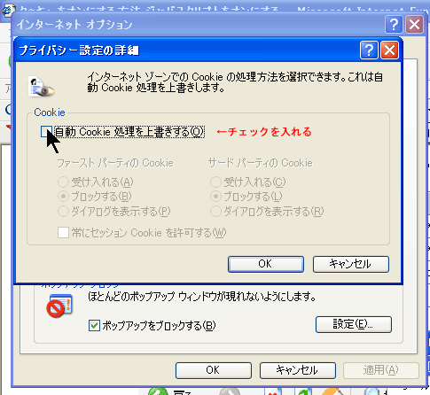 [ツール]→[インターネットオプション]→[セキュリティ]→[レベルのカスタマイズ]→[Cookie] |