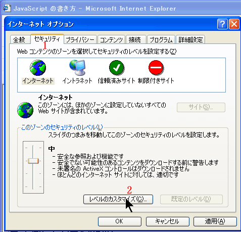 [ツール]→[インターネットオプション]→[セキュリティ] でゾーンを選択して [レベルのカスタマイズ]→[スクリプト]→[アクティブスクリプト]