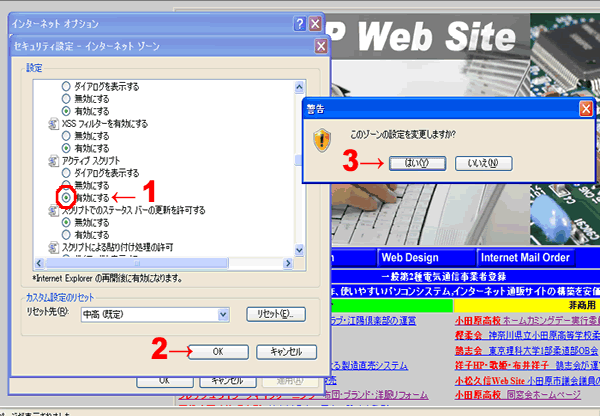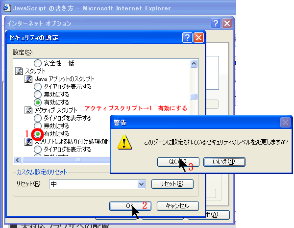 [ツール]→[インターネットオプション]→[セキュリティ]→ [レベルのカスタマイズ]→[スクリプト]→[アクティブスクリプト]