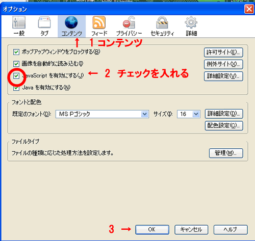 [ツール]→[オプション]→[コンテンツ]→[JavaScriptを有効にする] 設定方法 |