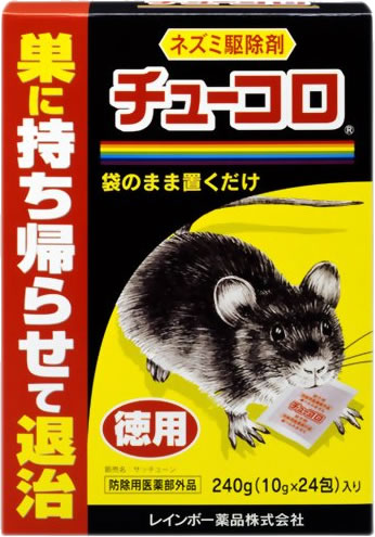 | 次は無駄金を使わないように慎重を期し、新たな対応を模索、兵糧攻め+殺鼠剤を試すことにした。まず食品は全て密閉容器に保存し、穴を開けられ,侵入されていないかを日々チェック。生ゴミは、蓋付きのポリバケツにいれ、穴・噛み痕をこまめにチェック。 殺鼠剤は2種類試した、最初に、大手の殺鼠剤、これは兵糧攻めを始めたばかりのせいもあったのか、いまいち食いが悪かった。 兵糧攻めを継続しながら次の殺鼠剤へ、ホームセンターで購入したレインボー薬品製「チューコロ」、これが効果抜群、ネズミ出没地点に置き、なくなる度に補充する事数ヶ月、完全駆除に成功しました。なお、同時に粘着シート・駕籠製のネズミとりも併用しました。 米びつの上で大物が粘着シートで一匹、ネズミ取り駕籠(餌はパン)で子ネズミが二匹、捕獲できました。 結論::兵糧攻め+殺鼠剤で駆除できたと云う事です、総費用(食品保管容器+蓋付き生ゴミ入れ+チューコロ×2箱)で5,000円位、ペストコントロ一台より安くて効果が認められる。 |