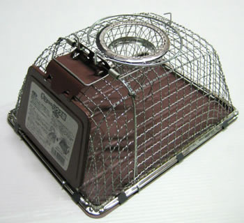 | 昔懐かしい篭式のトラップ、幼体二匹しか捕獲できず、一度捕獲すると警戒されて次の捕獲までかなりの間隔が必要、結局二匹捕獲した後は使用しなかった。 | プロも使用する粘着シート、通り道や出没地点に設置するのだが、スペースが確保できない場合が多く、ネズミの足にホコリ・水などが付着していると吸着剤に絡めとれないこともあるようで、設置が難しく10枚程度使用した時点で使用取りやめ、ただ大物を出没地点(米びつの上)で捕獲(確認した時点ですでに死んでいた)。条件が合えば有効な方法かもしれない。 | |